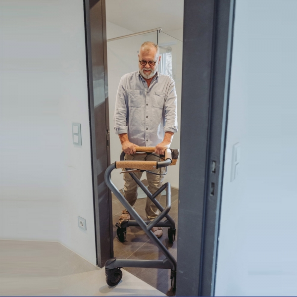 …sont les caractéristiques essentielles d'un déambulateur d'intérieur. Ce déambulateur offre un soutien complet aux utilisateurs pesant jusqu'à 150 kg. Les poignées recouvertes de liège offrent un confort optimal pour vos mains. Pour une stabilité accrue lors de la marche en ligne droite, vous pouvez facilement bloquer les roues arrière. Le WR pivote sur place avec un rayon de braquage de seulement 66 cm. Cela le rend incroyablement maniable, même dans les cuisines et les couloirs étroits.