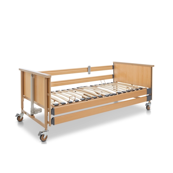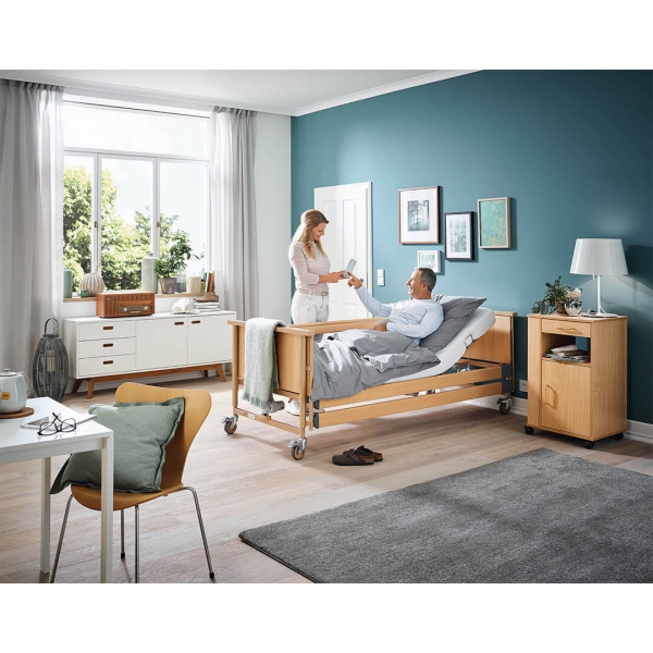 Le lit de soins Dali de Burmeier est idéal pour le domicile. Equipé d'un sommier à lattes en bois et d'un cadre complet en bois, il s'intègre très bien dans la chambre à coucher